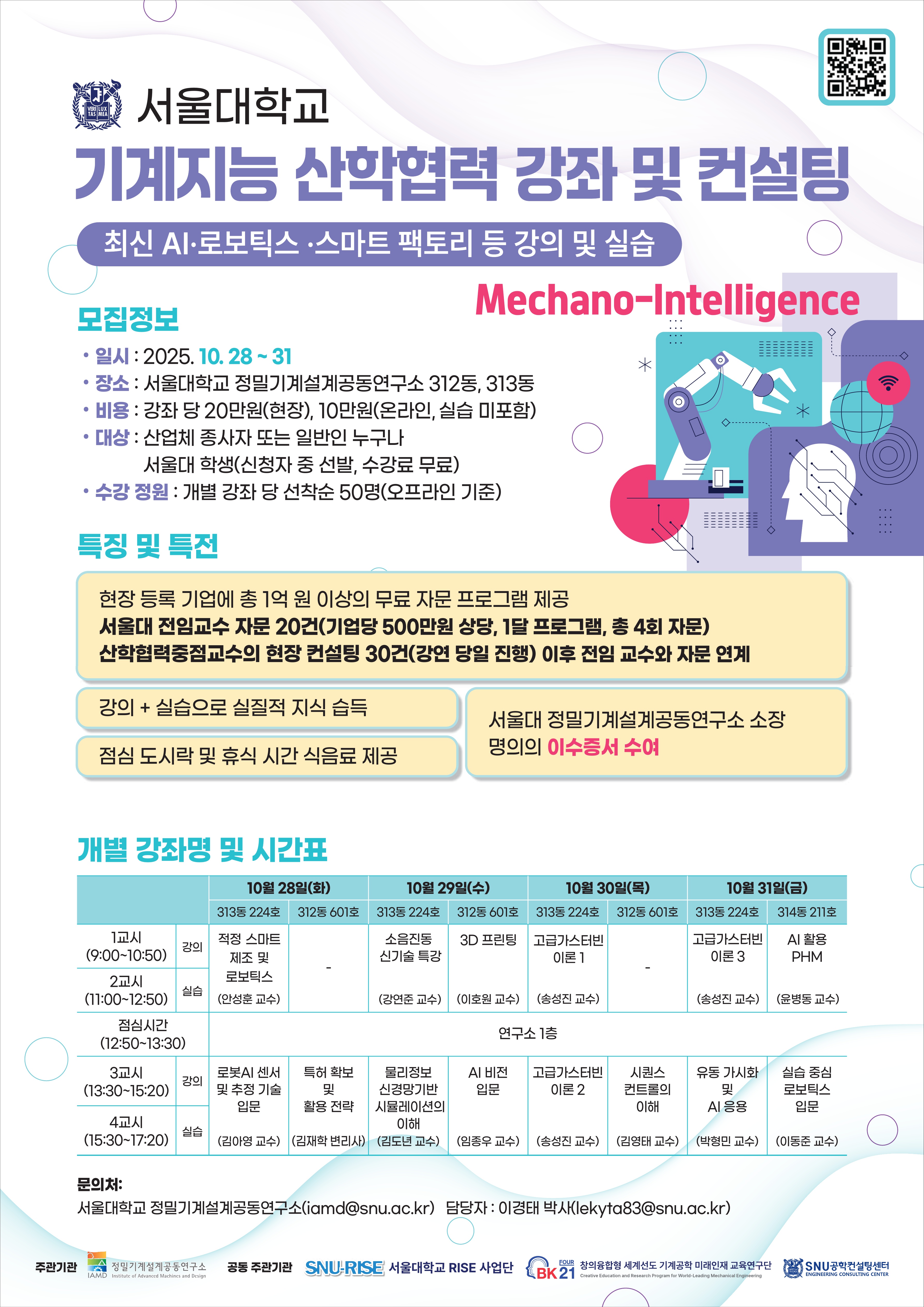 서울대학교 정밀기계설계공동연구소가 주관하는 「기계지능 산학협력 공개강좌」가 오는 2025년 10월 28일부터 31일까지 개최됩니다.