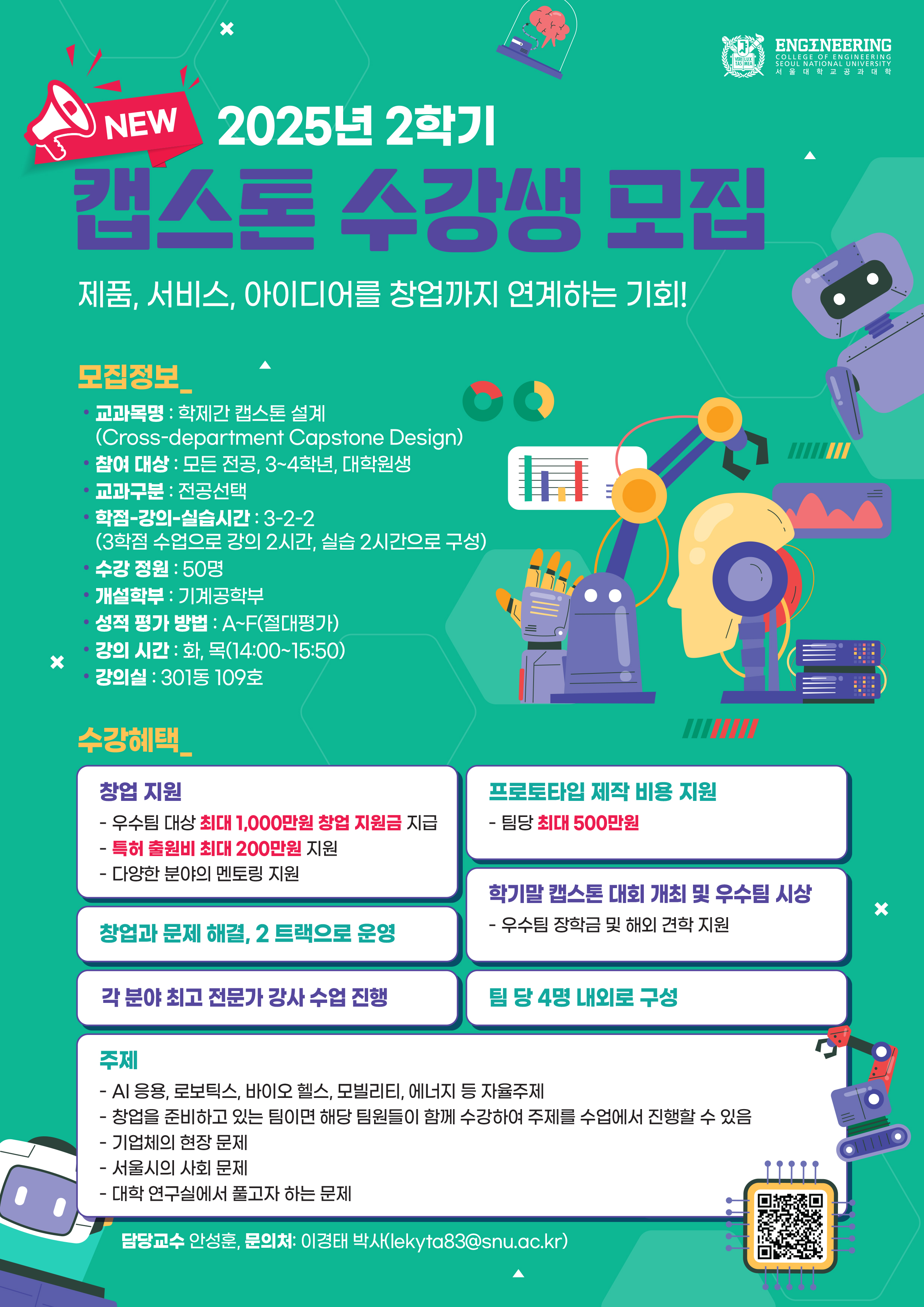 서울대학교 RISE 사업단에서 2025학년도 2학기부터 '학제간 캡스톤 설계' 과목을 신규 개설함을 알려드리오니, 관심 있는 학생은 참고하시기 바랍니다.
